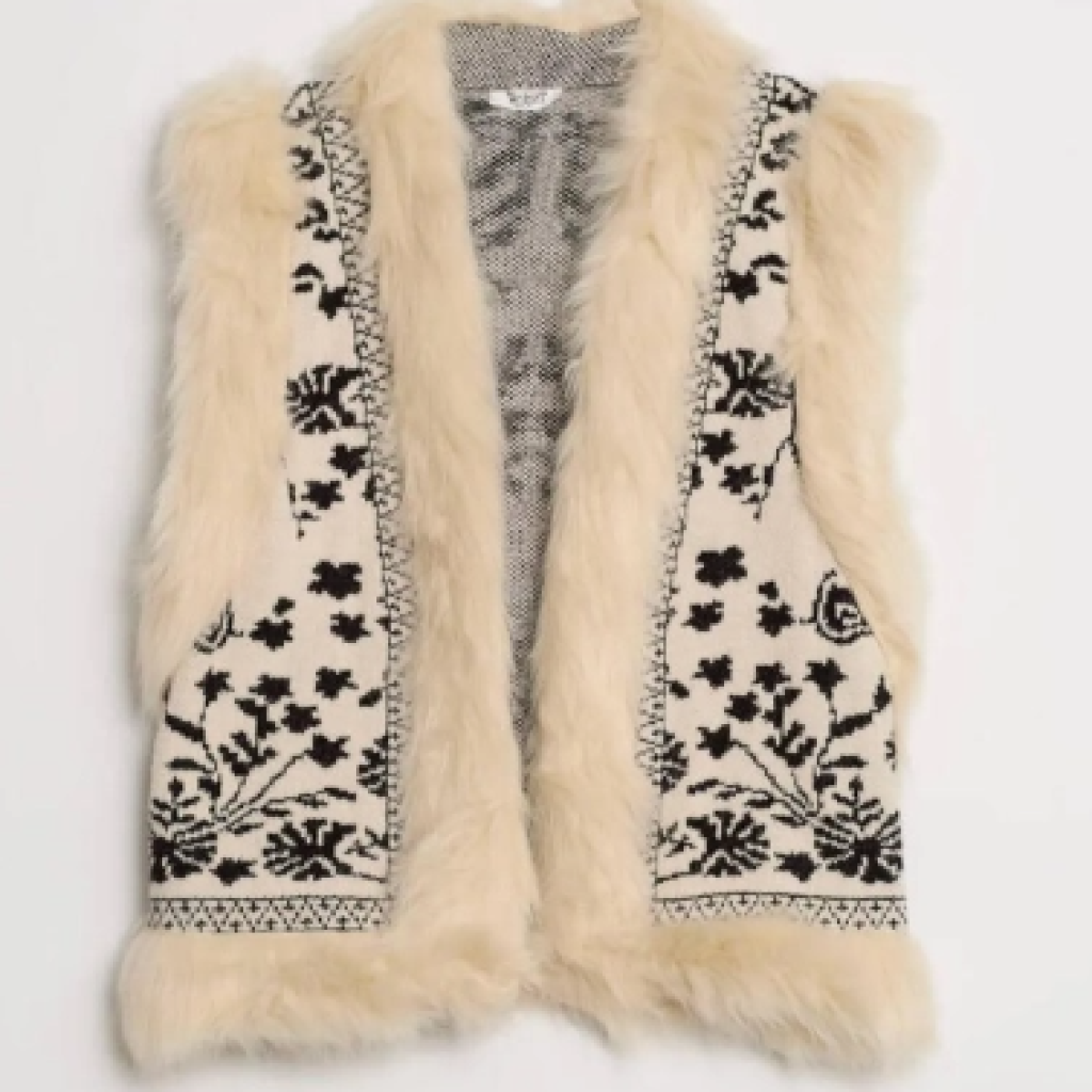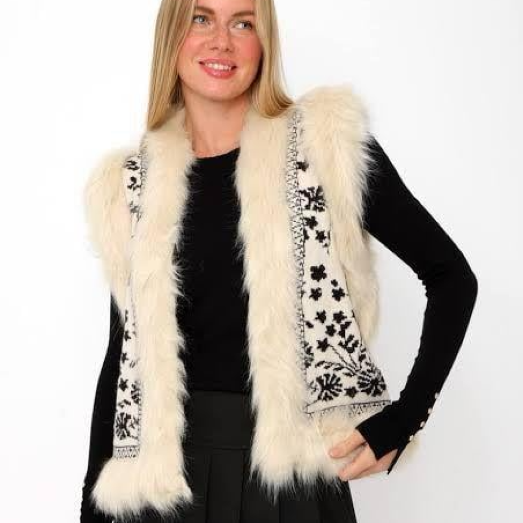 Siyah Beyaz Desenli Kürklü Triko Yelek