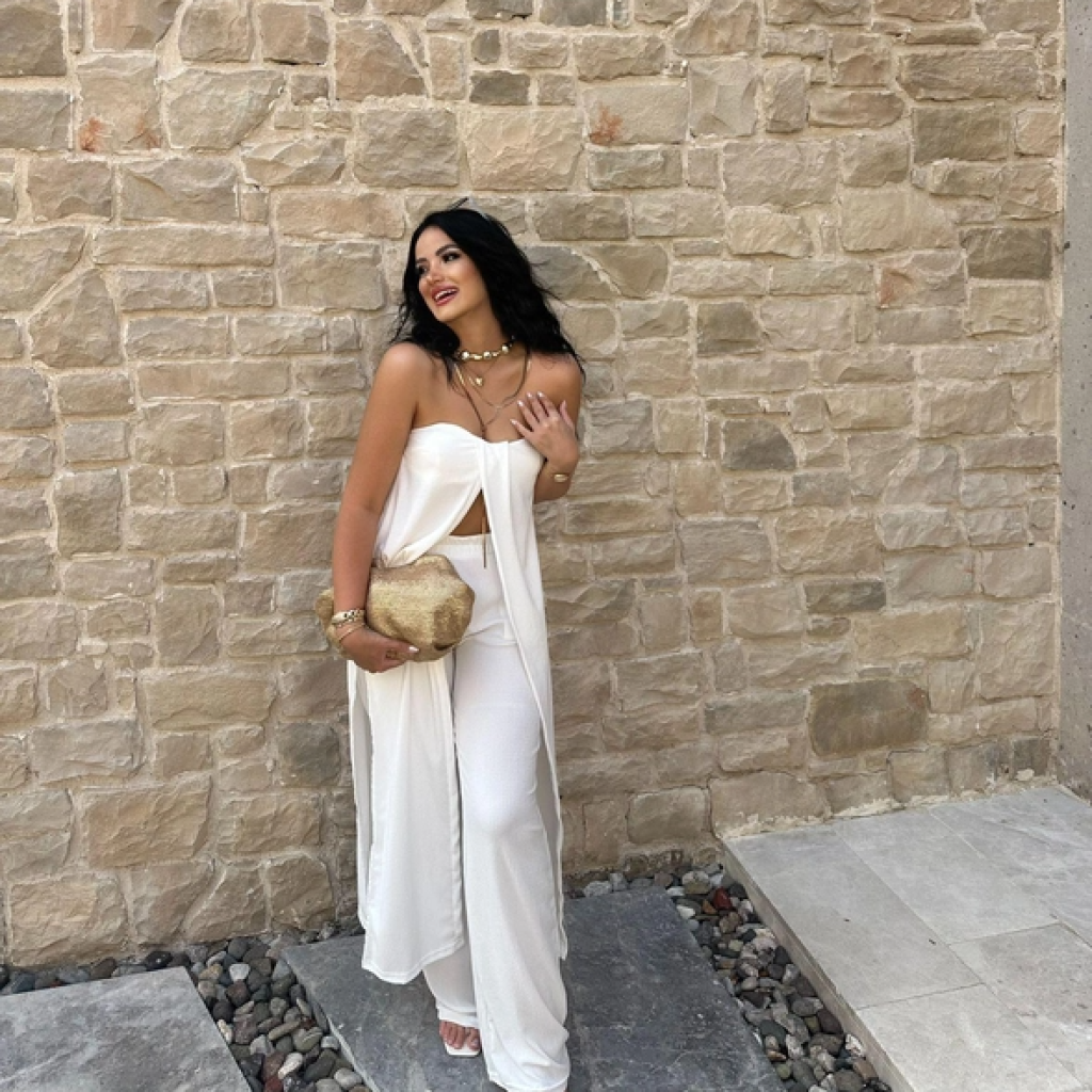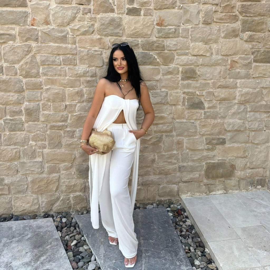 Beyaz Bürümcük Straplez Tunik Pantolon Takım