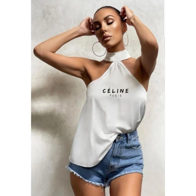 Beyaz Celine Yazılı Yaka Detaylı Sırt Dekolteli Bluz