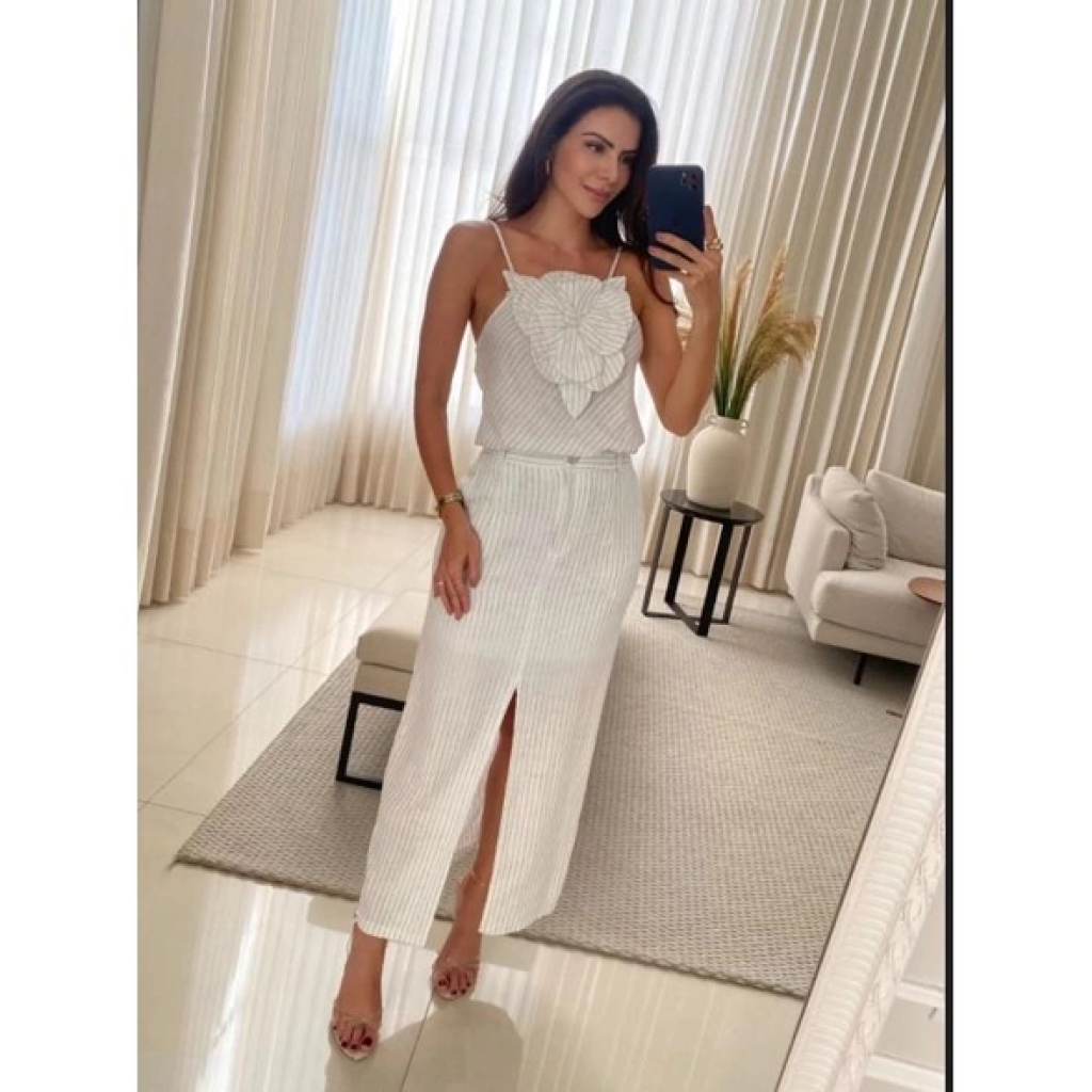 Beyaz Keten Kumaş Çizgili Yırtmaçlı Etek Ve Yakası Çiçek Detaylı Büstiyer Takım
