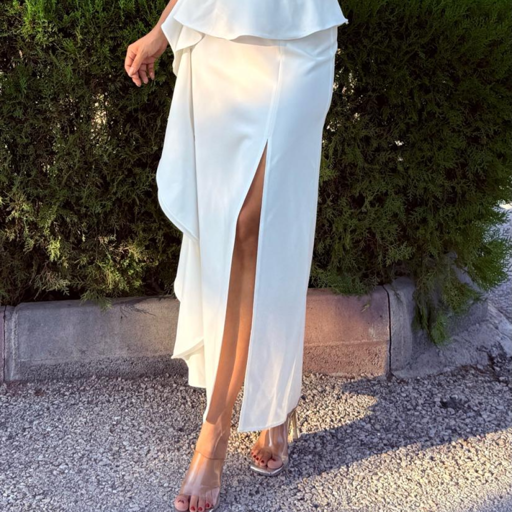 Beyaz Üzeri Siyah Desenli Derin Yırtmaçlı Etek