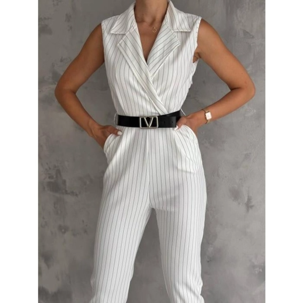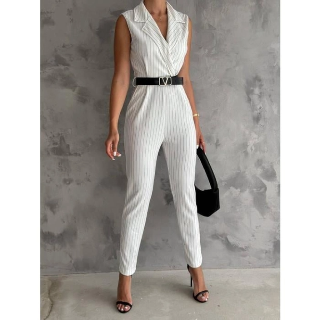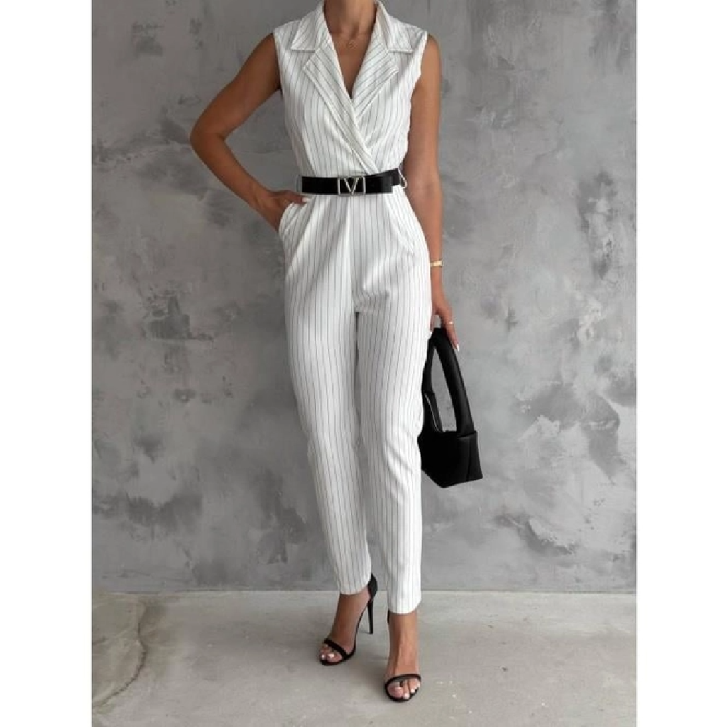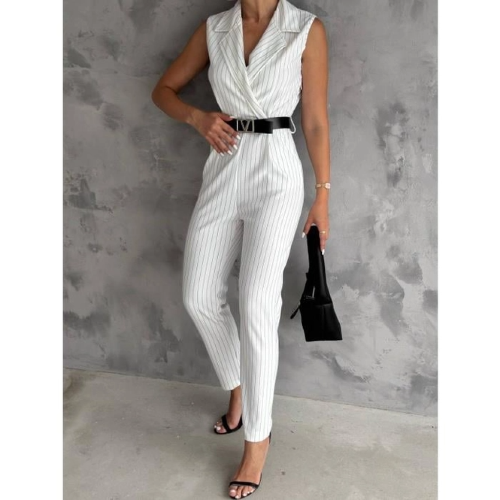 Beyaz Sİyah Çizgili Kruvaze Krep Kumaş Kemer Detaylı Tulum