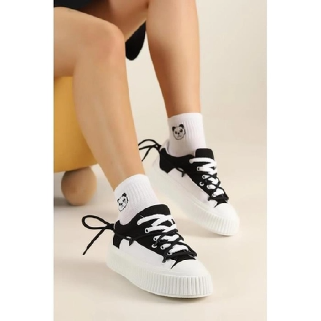 Beyaz Tabanlı Siyah İp Ve Garni Detaylı Tasarım Spor Ayakkabı