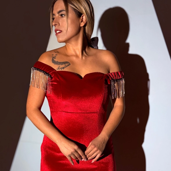 Kırmızı Kadife Omuzu Taşlı Yırtmaçlı Elbise