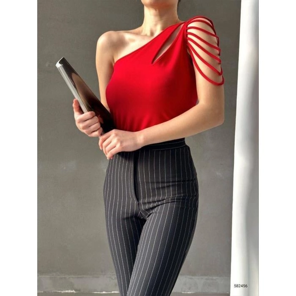 Kırmızı Tek Kol Omuzu İp Detaylı Tasarım Bluz
