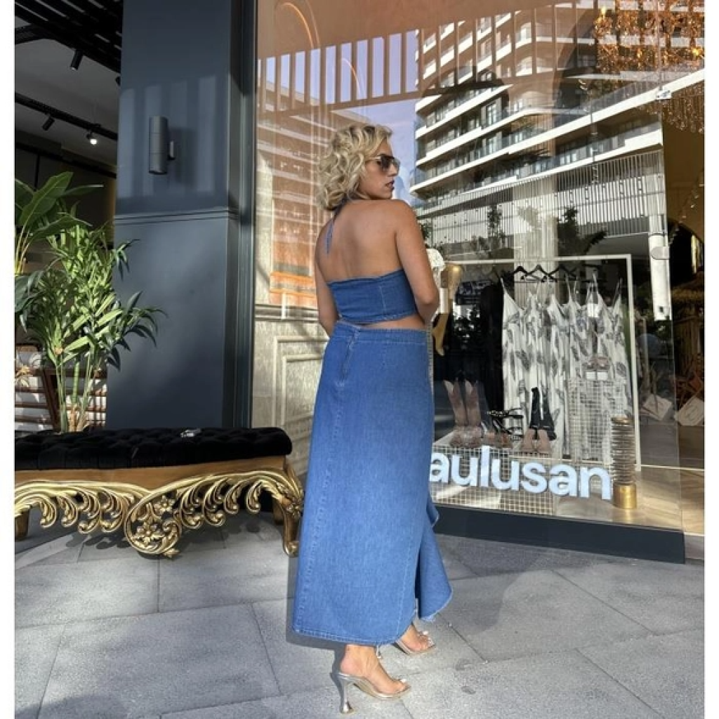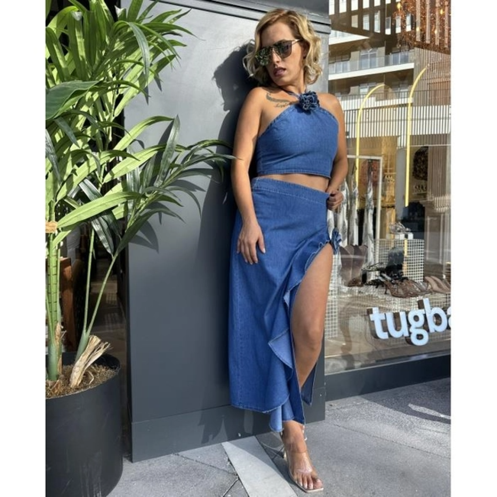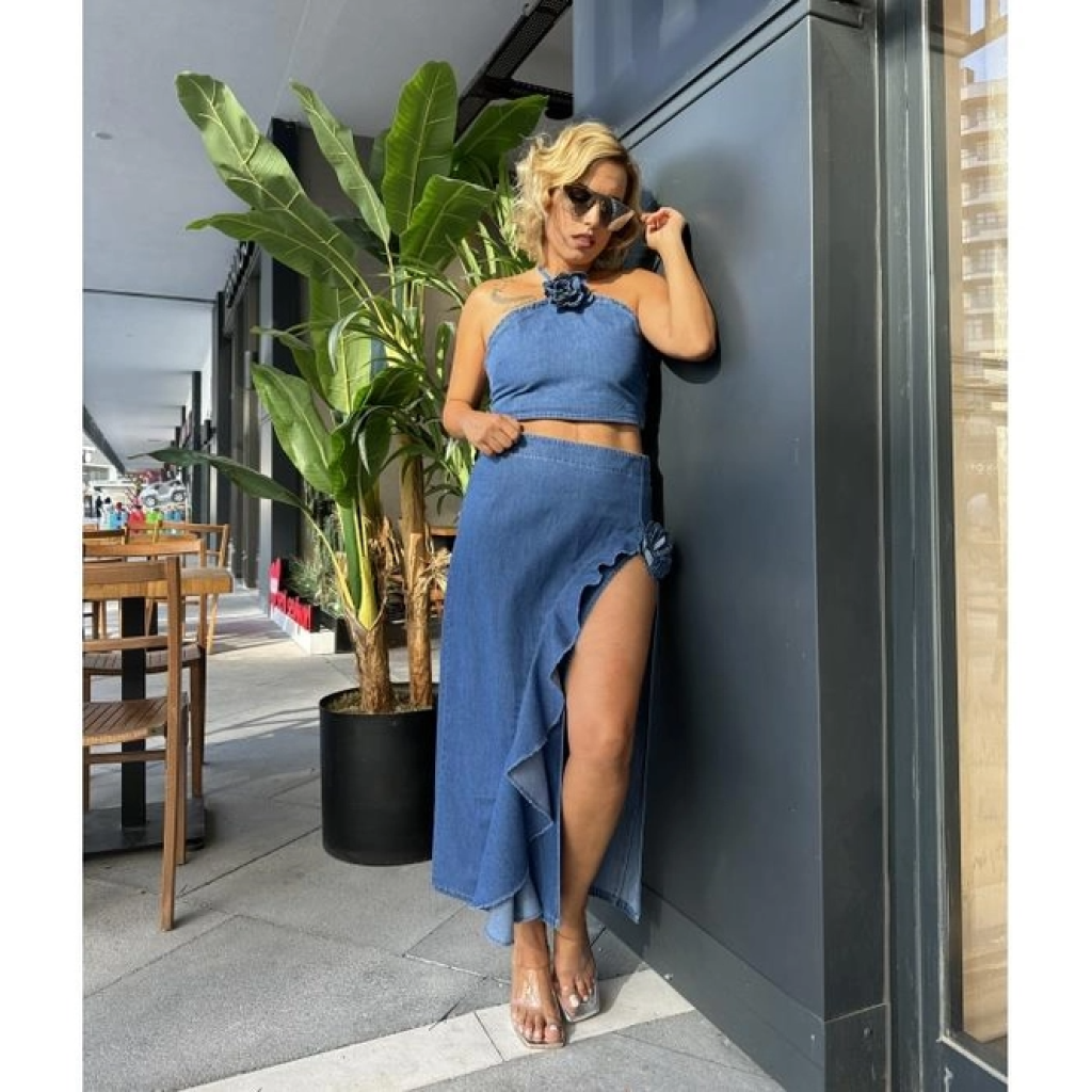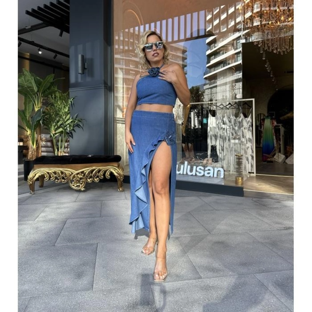 Kot Gül Detaylı Crop Uzun Yırtmaçlı Etek Takım