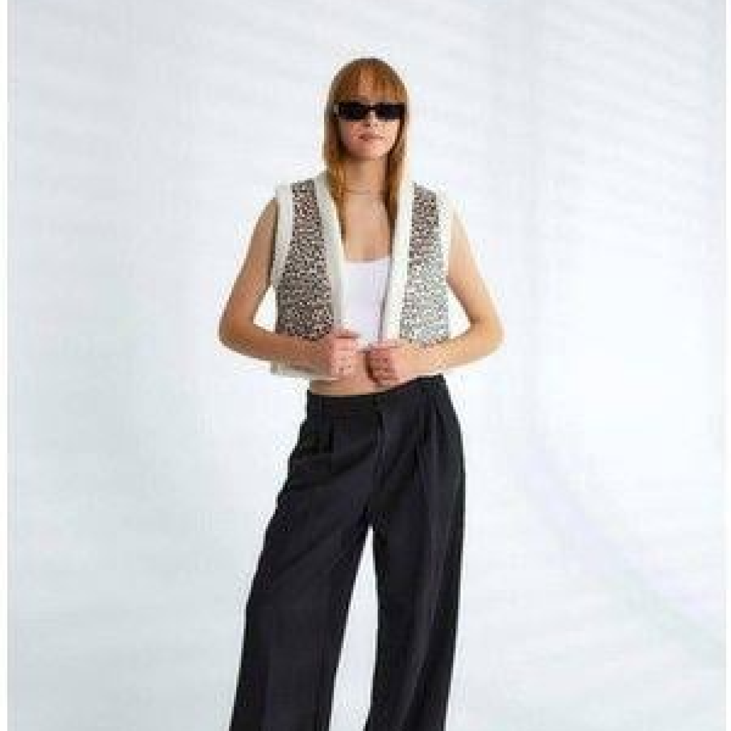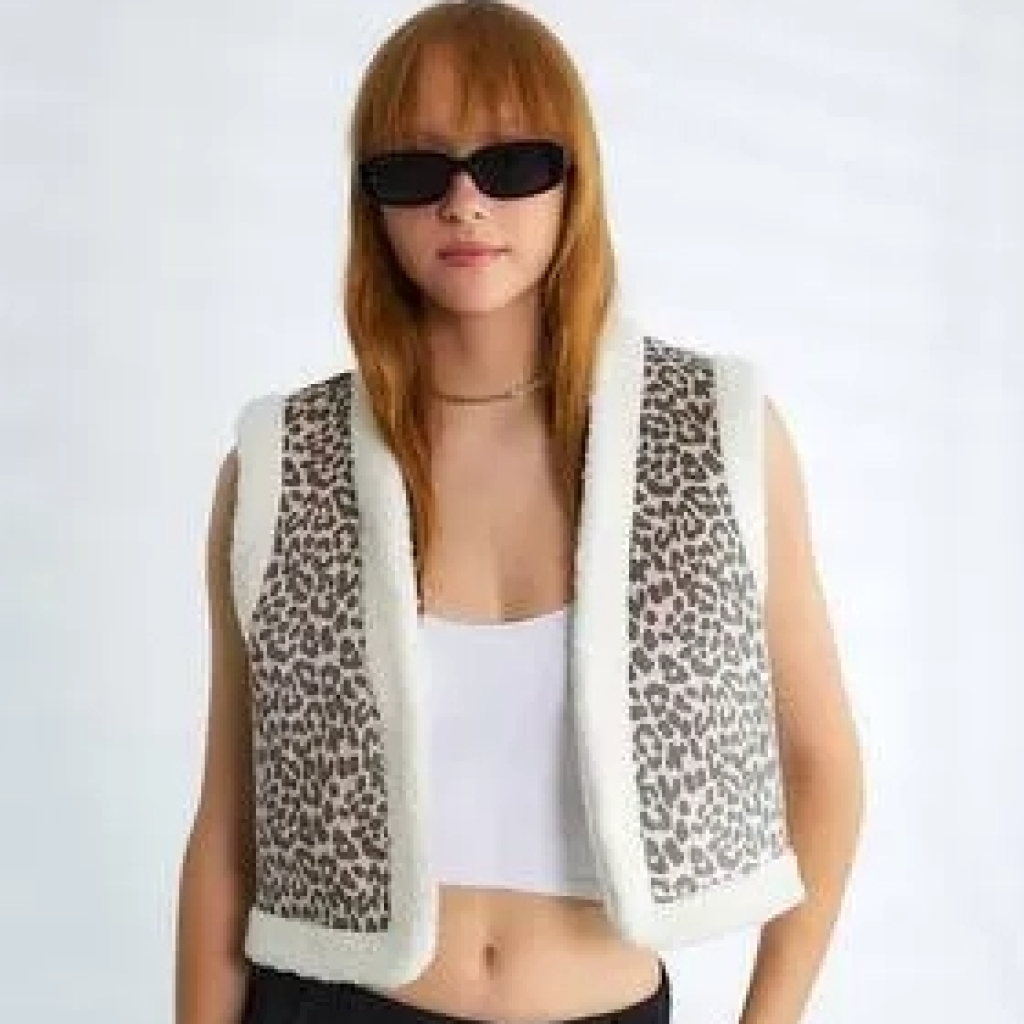 Siyah Beyaz Desenli Kürklü Triko Yelek
