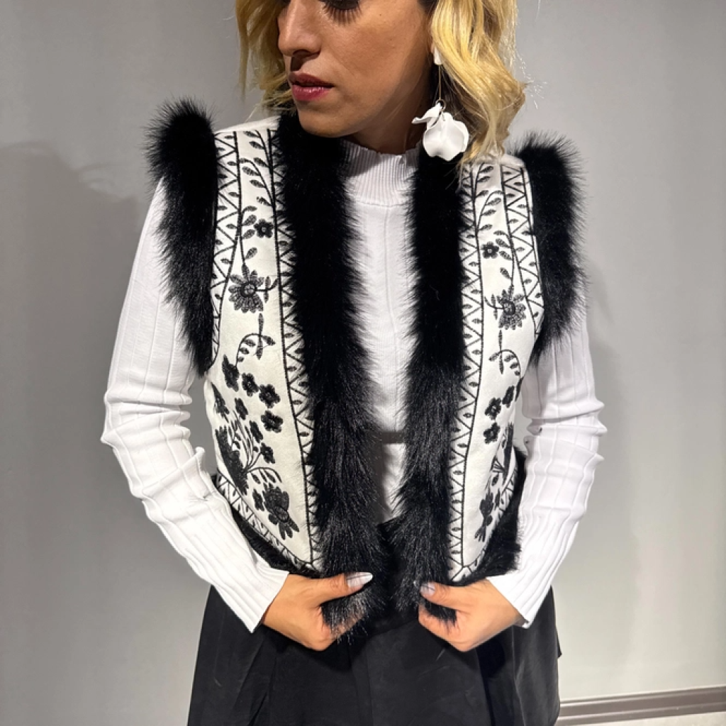 Siyah Beyaz Desenli Kürklü Triko Yelek