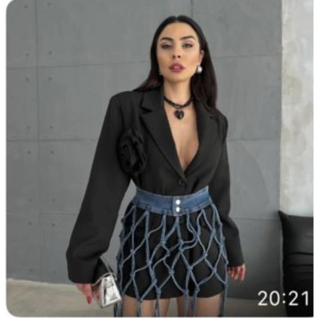 Siyah Gül Detaylı Kot Püskül Kemerli Ceket