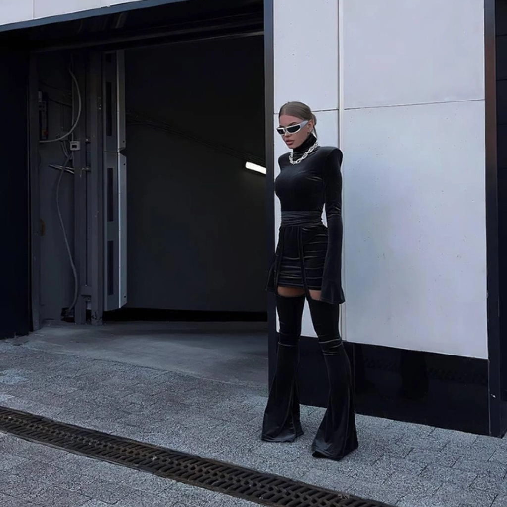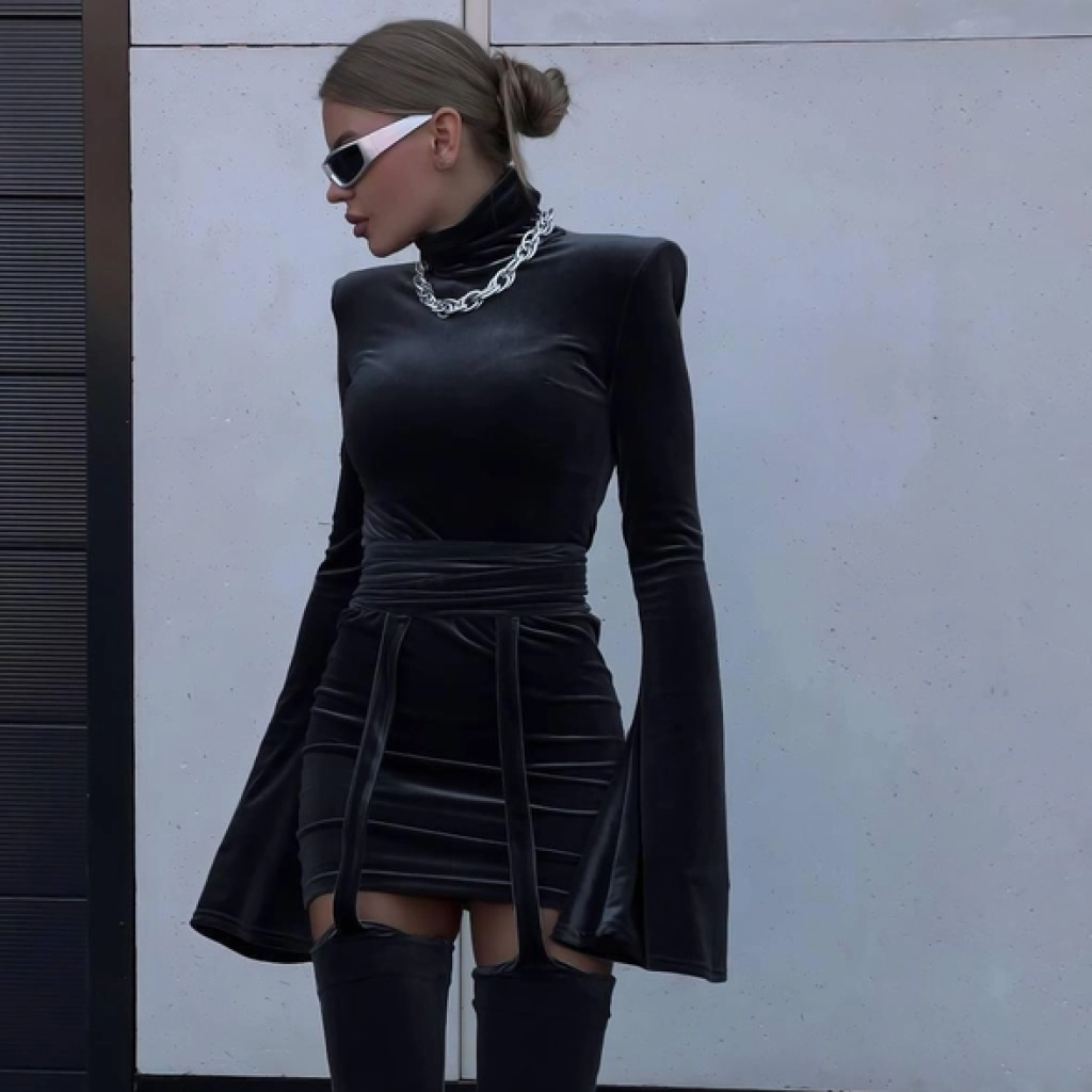 Siyah Simli Tek Kol Kazak Mini Etek Takım