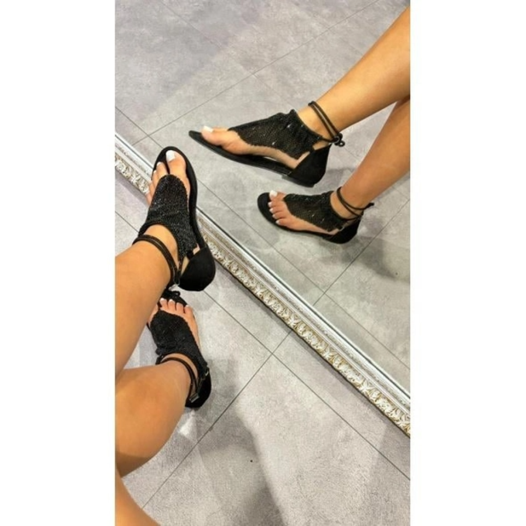 Siyah Parmak Arası Bilekten Bağlamalı Taşlı Sandalet