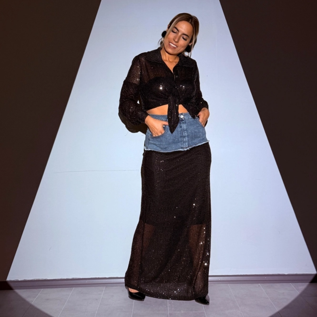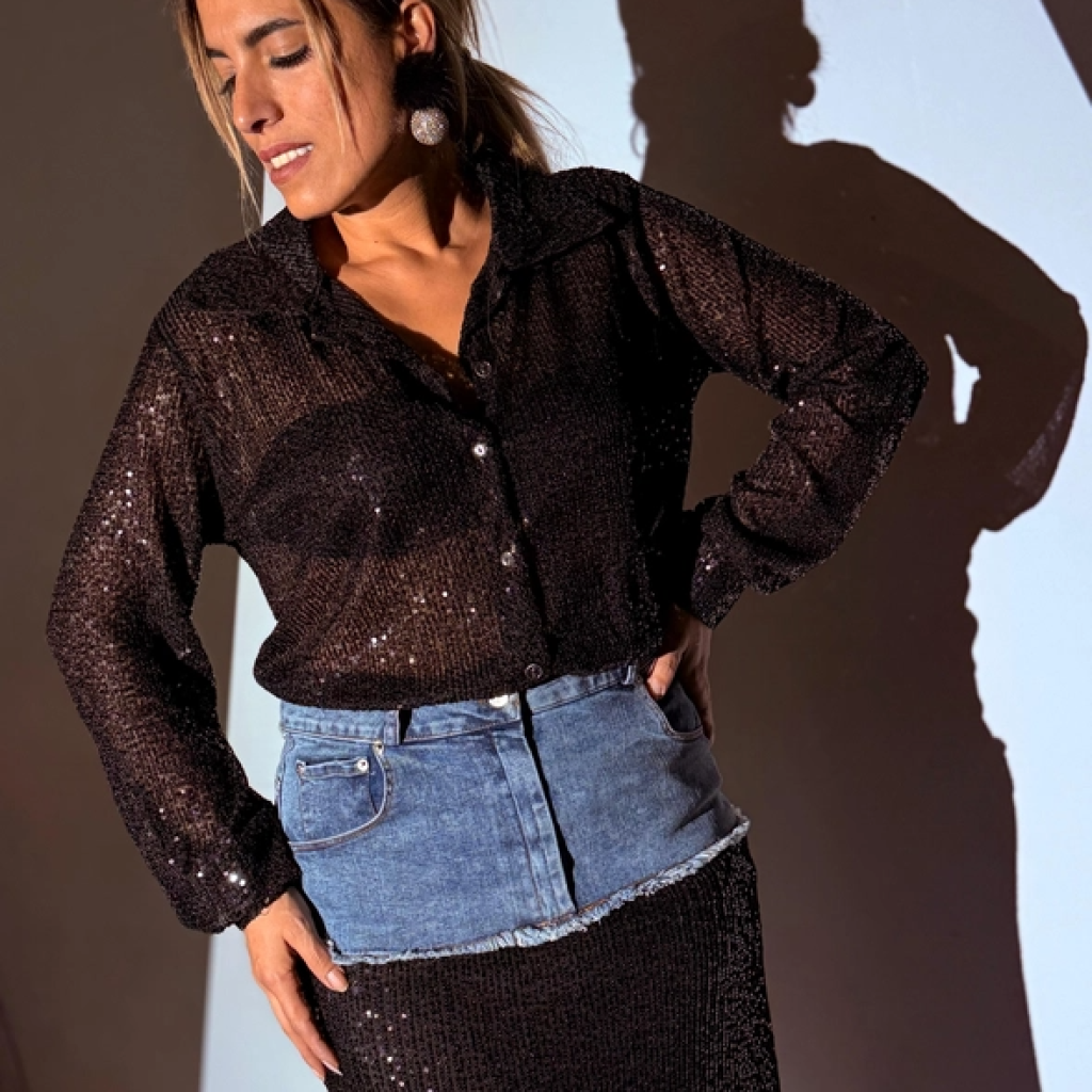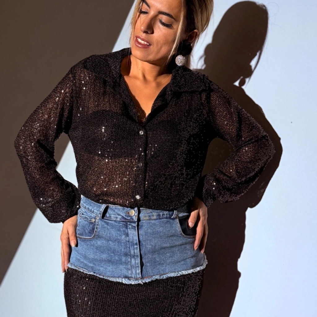 Siyah Saten Kumaş Çiçek Desenli Gömlek