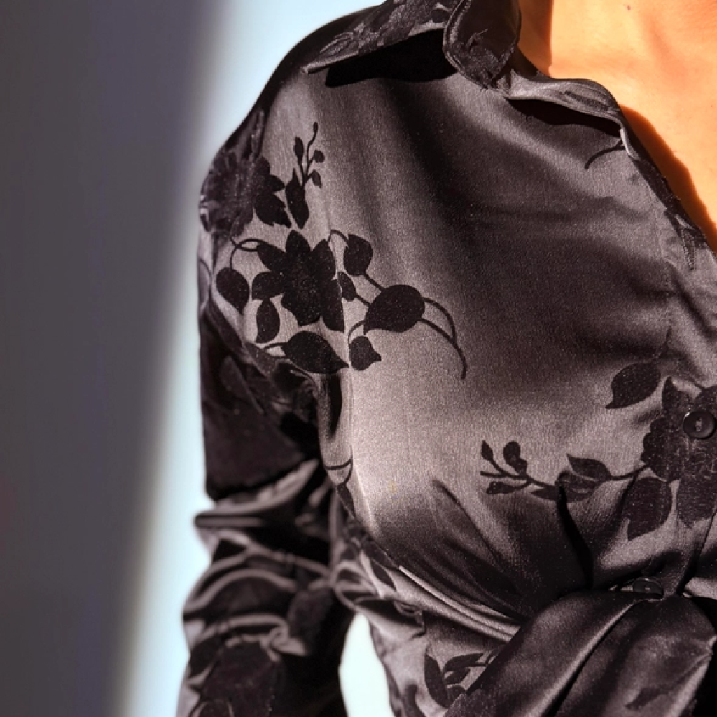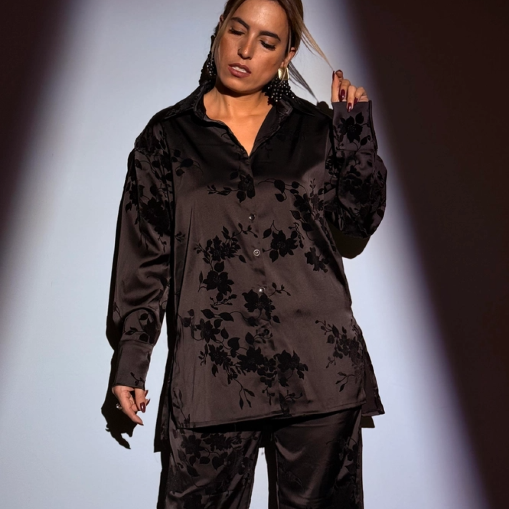 Siyah Saten Kumaş Çiçek Desenli Gömlek