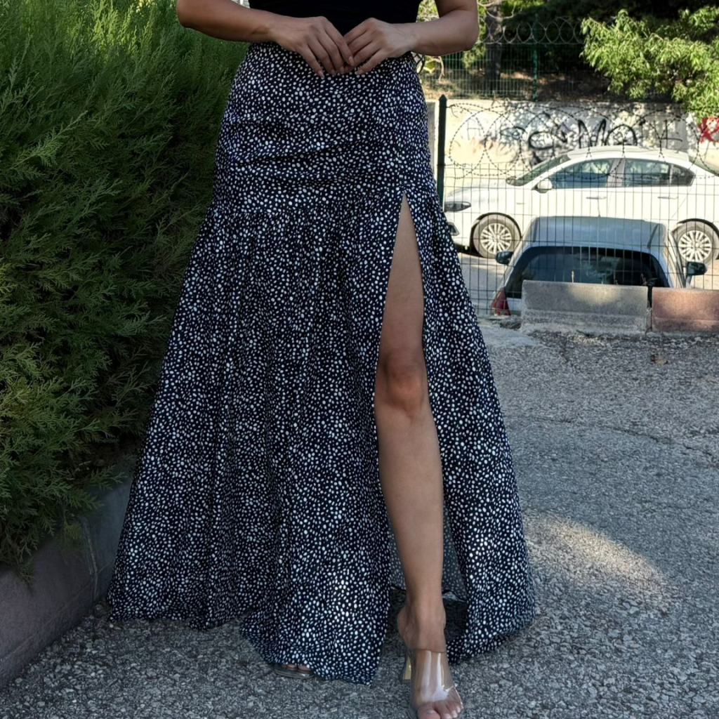 Siyah Üzeri Beyaz Desenli Derin Yırtmaçlı Etek