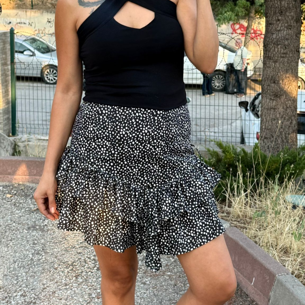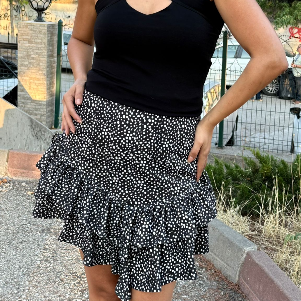 Siyah Üzeri Beyaz Desenli Fırfırlı Mini Etek