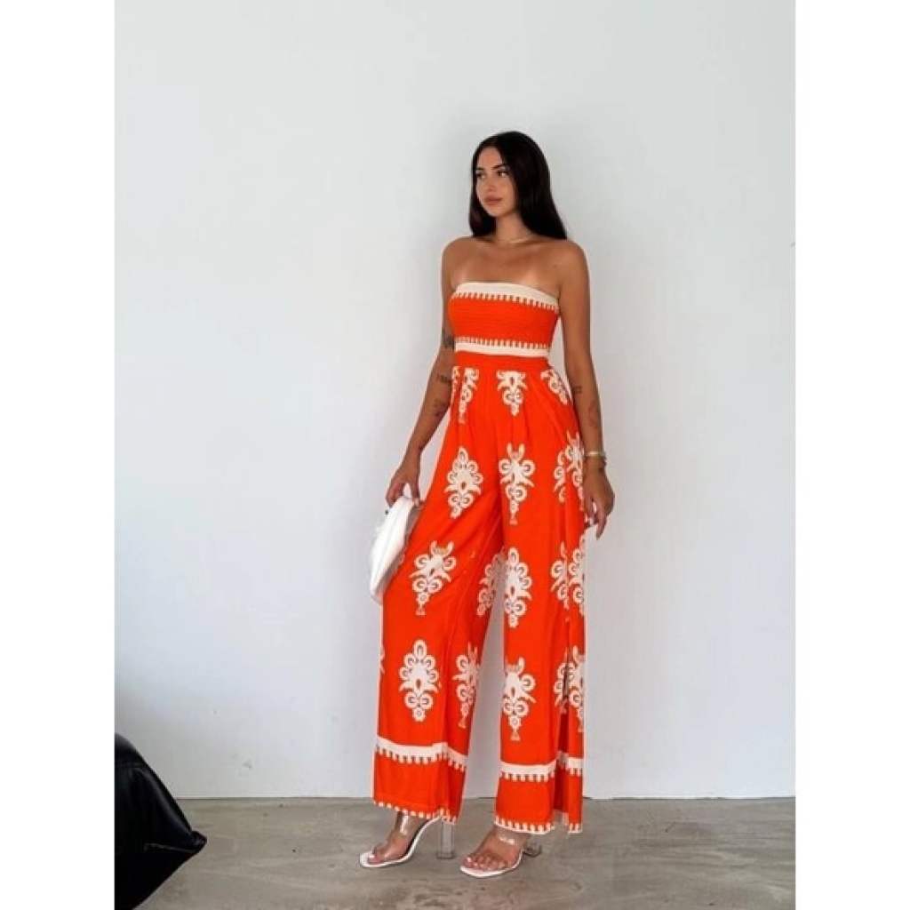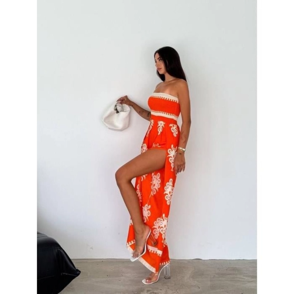 Straplez Etnik Desen Turuncu Beyaz Tulum