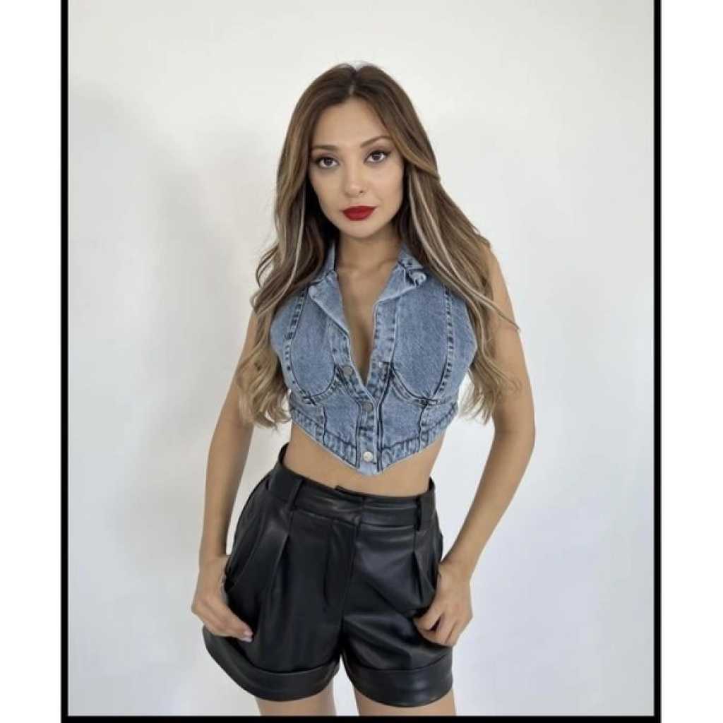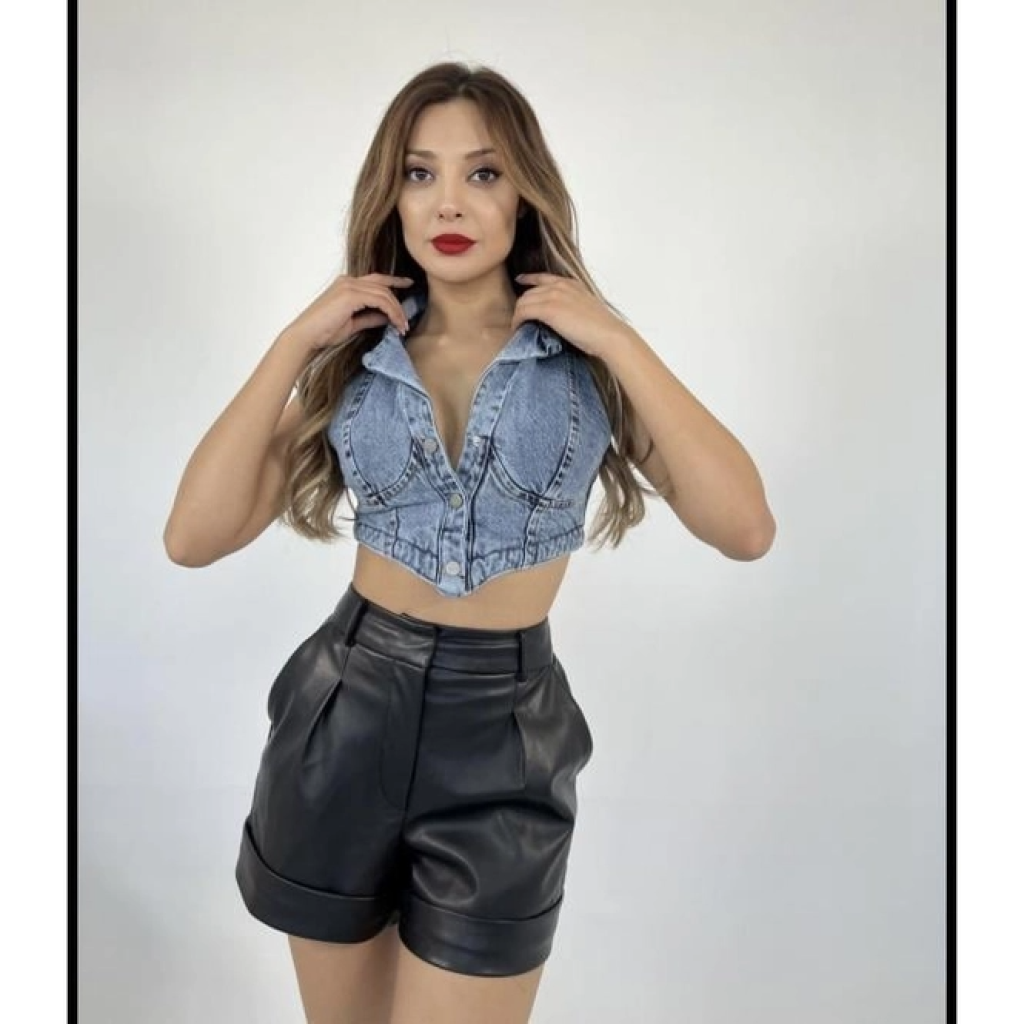 Yaka Detaylı Önü Düğmeli Kot Yelek