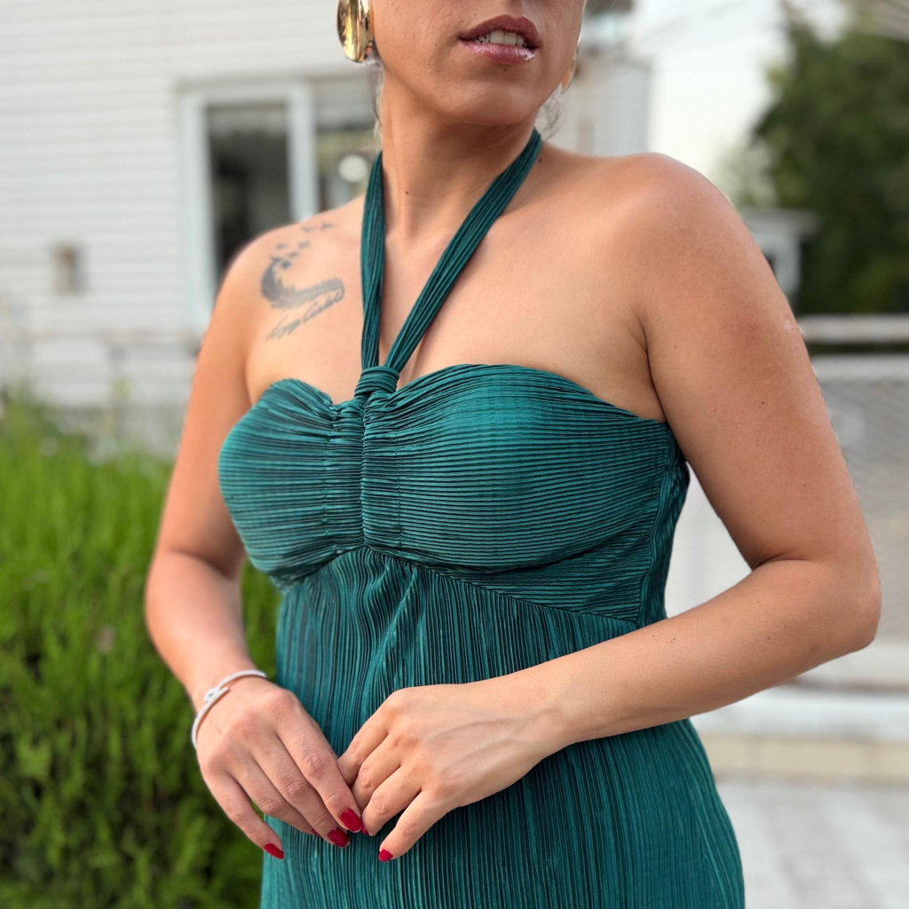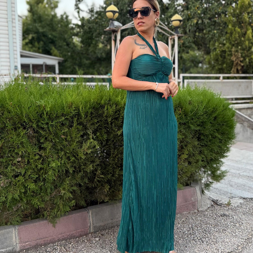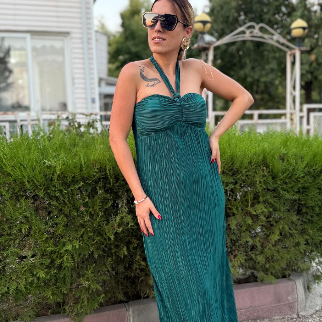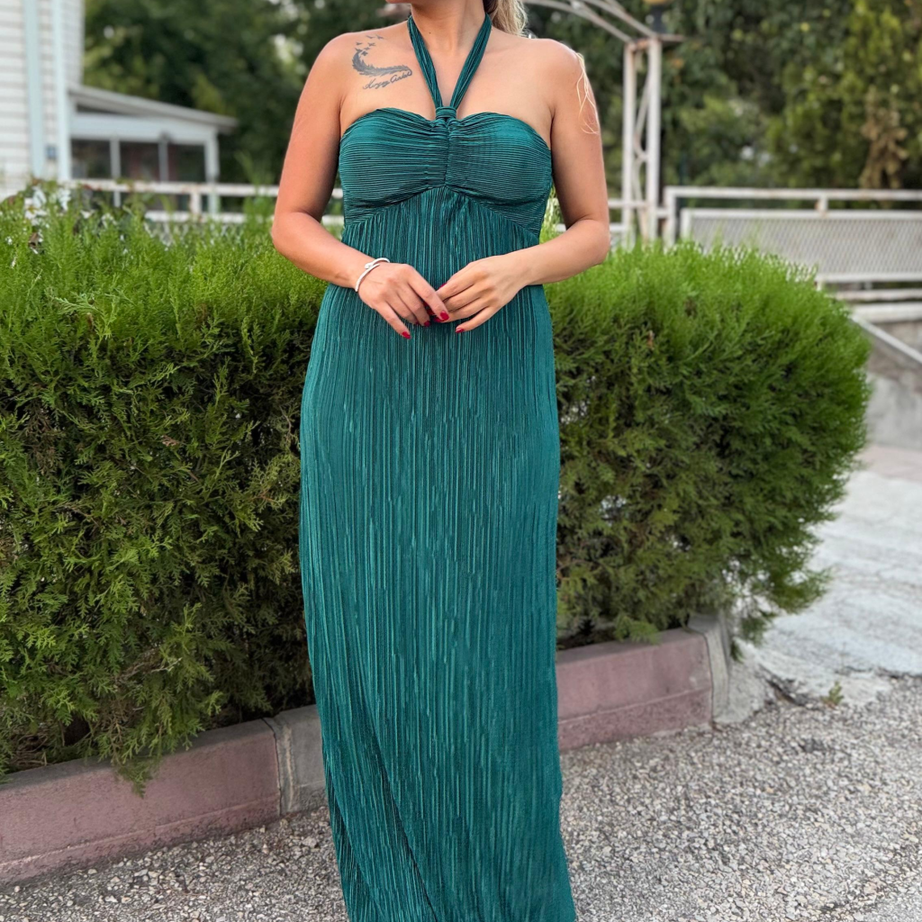 Zümrüt Yeşili Saten Pilise Göğüs Kuplu Boyundan Bağlamalı Uzun Elbise